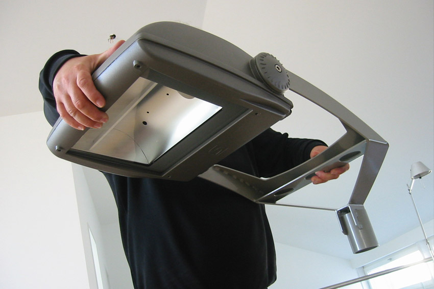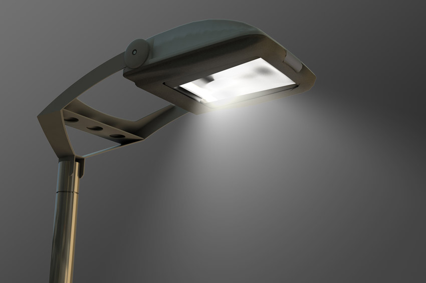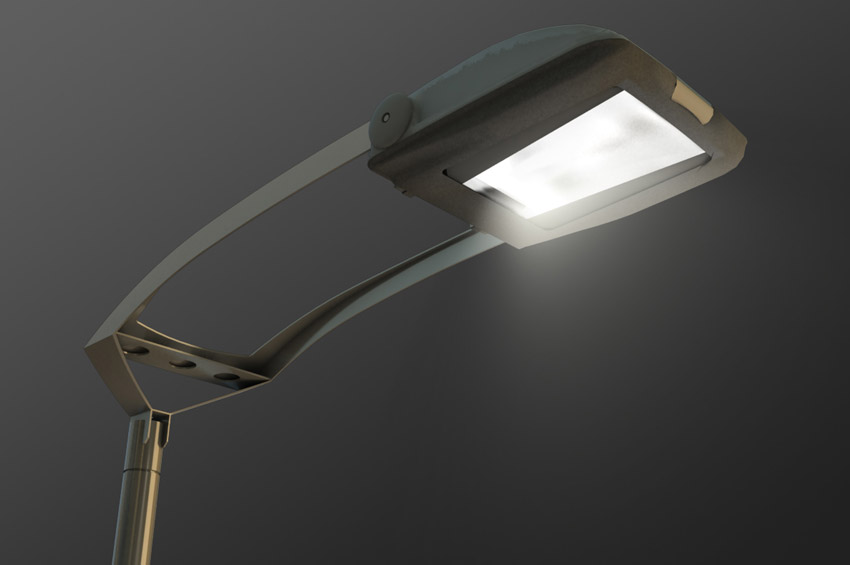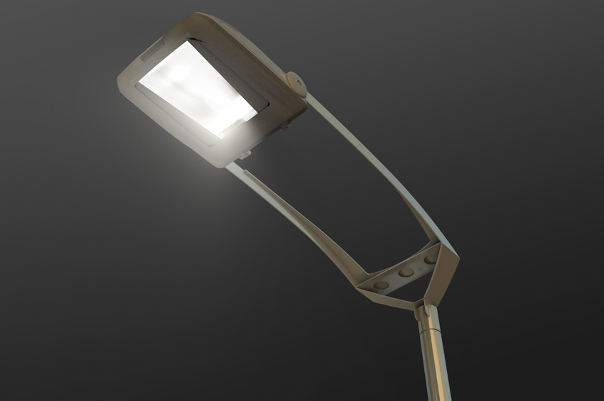 Weitere 3D Renderings zeigen als generelle Ansichten die Lampe selbst auf grauem Hintergrund. Die Visualisierungen wurden in Vray erstellt, um ein möglichst fotorealistisches Abbild des Lichtssystems zu erzeugen.