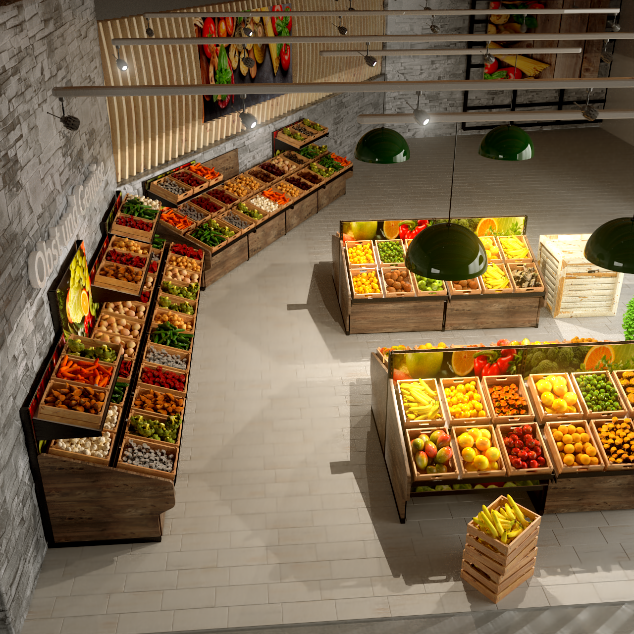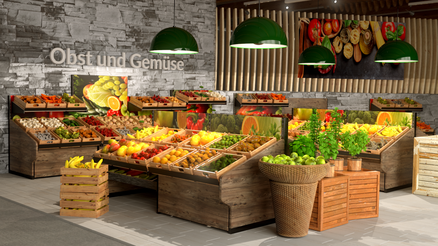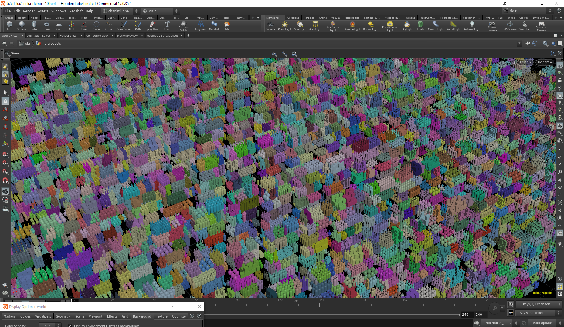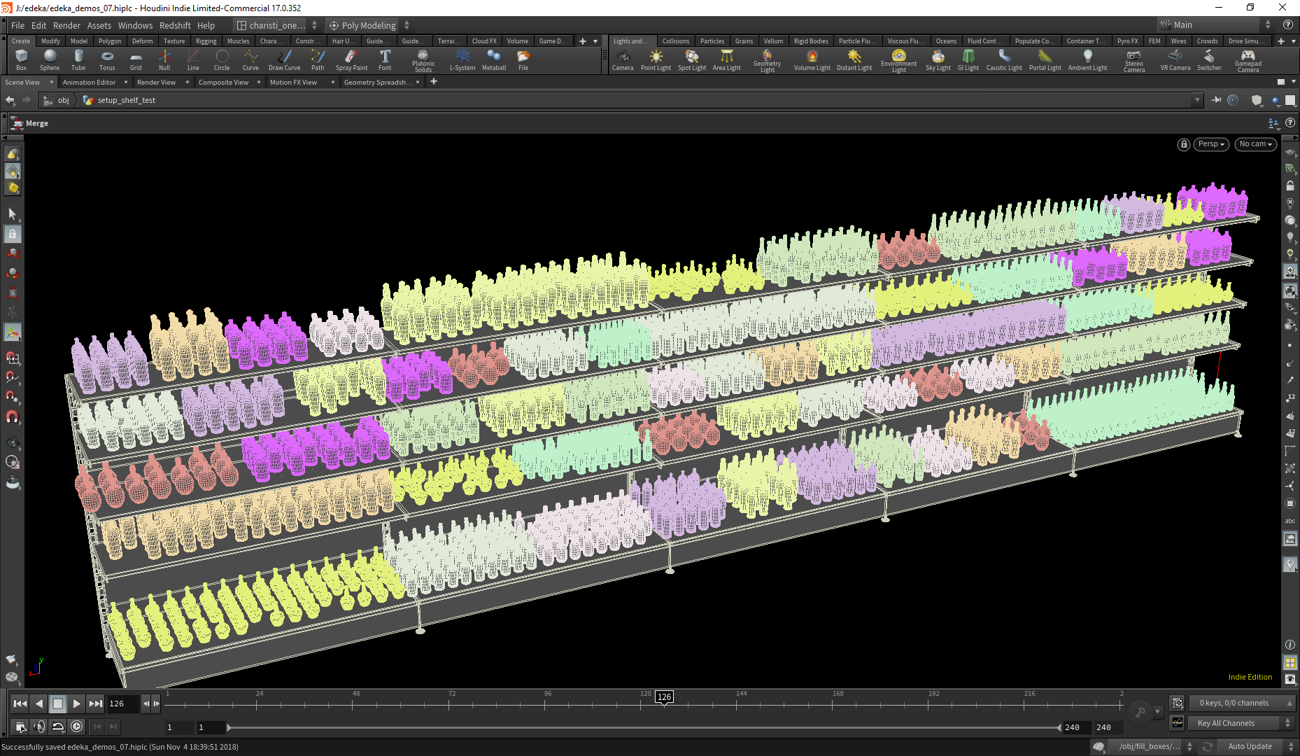 Kisten, Körbe, Obsttheken. Alles kontrollierbare Houdini HDAs mit veränderbaren Parametern. Eine Datenbank an Gemüse und Früchten. So lässt sich eine Szenen die normalweise Tage zu visualisieren dauert, um einiges schneller visualisieren.