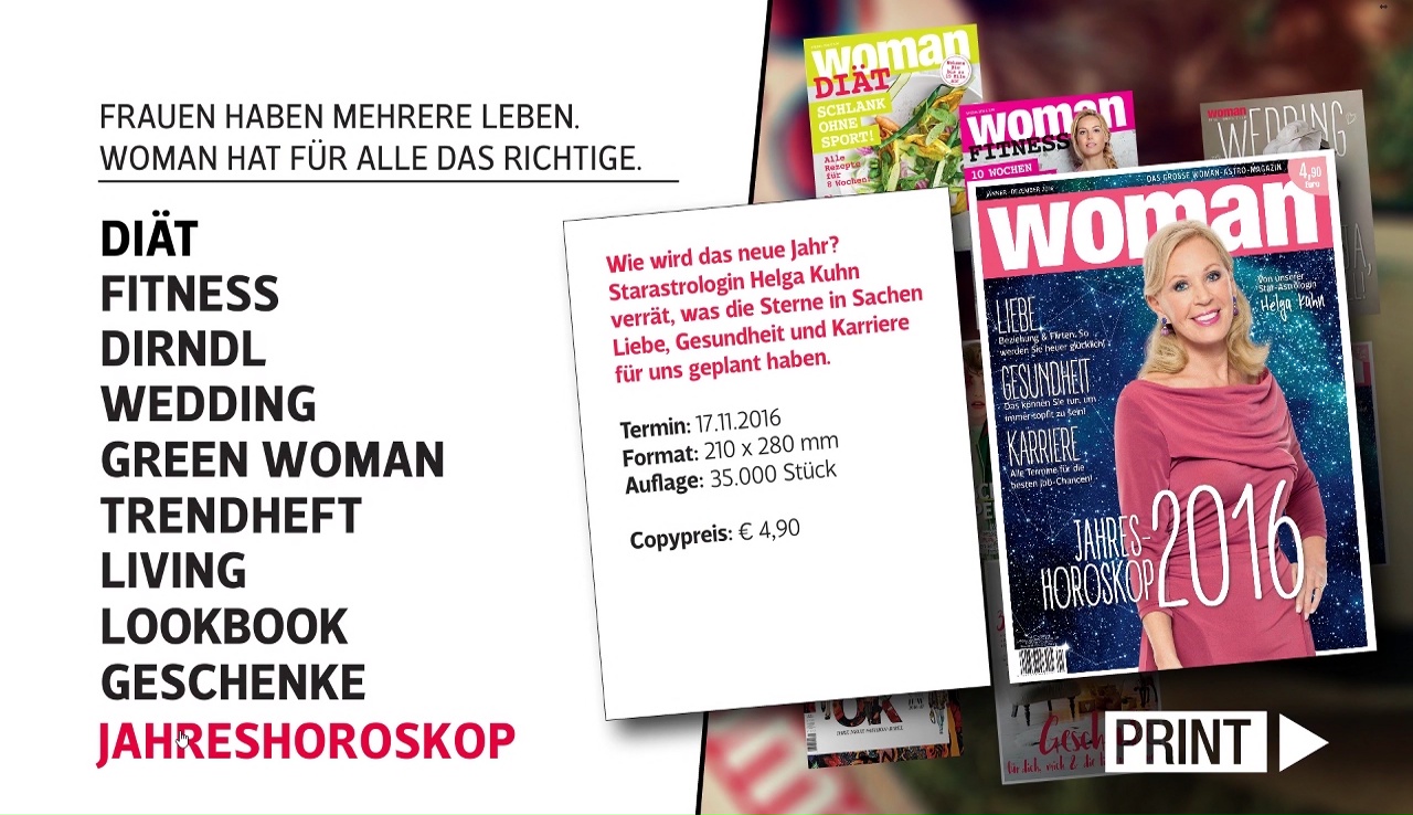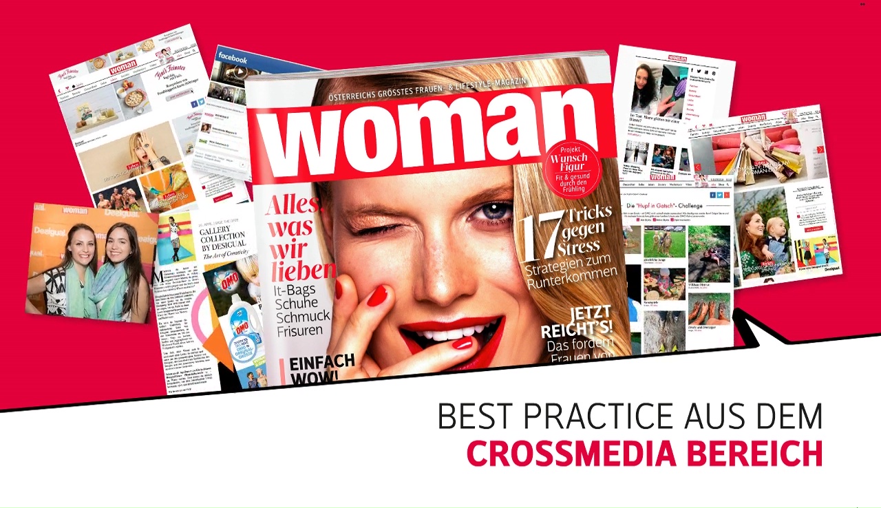 Die bekannte #KönnenWir Kampagne stellte animierte Übergänge zwischen den einzelnen Bereichen dar. Aktuelle Verkaufs- und Userzahlen wurden ebenso vorgestellt, wie der WOMAN Day, die verschiedenen Präsentationsplattformen im Print- oder Onlinesektor, oder auch der Creative Star Award mit Videoimplementierung, eine Auszeichnung für die besten und kreativsten Werbeumsetzungen.